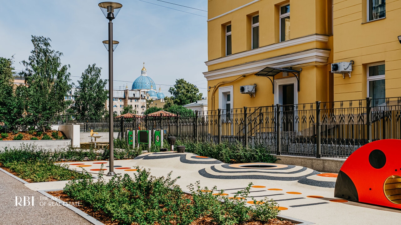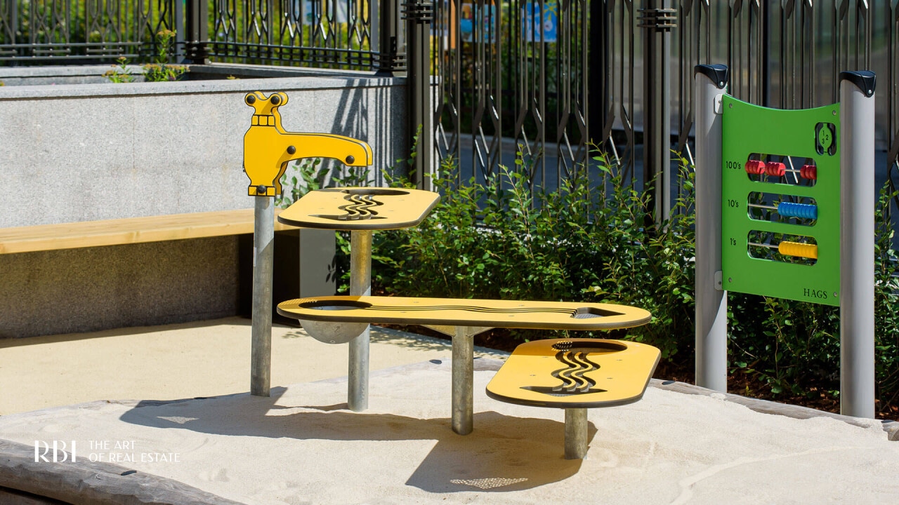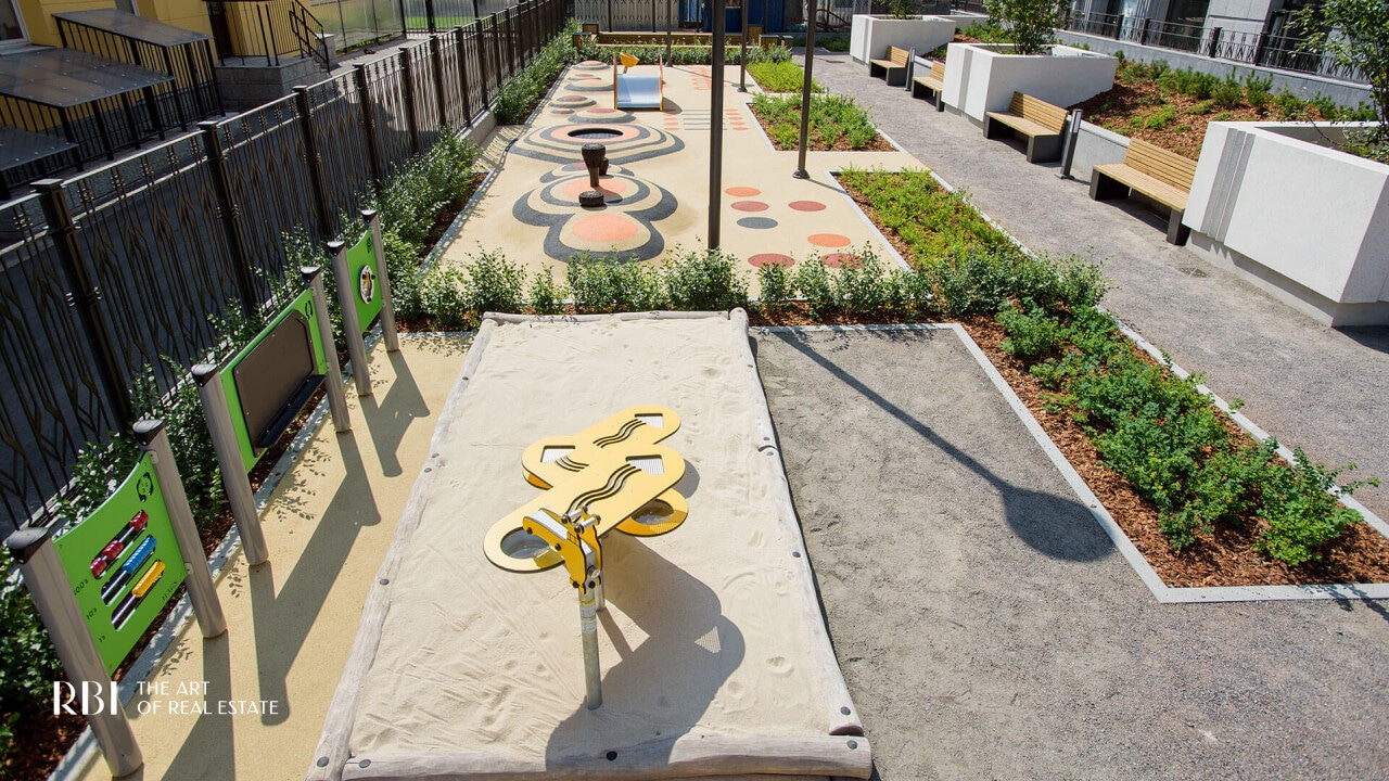 Детская площадка размещена отдельно, у третьего корпуса. Здесь собраны лучшие игровые элементы от иностранных производителей от Hags, Eibe и Kompan: балансиры, огромный эскаватор и оборудование для знакомства с законами природы.