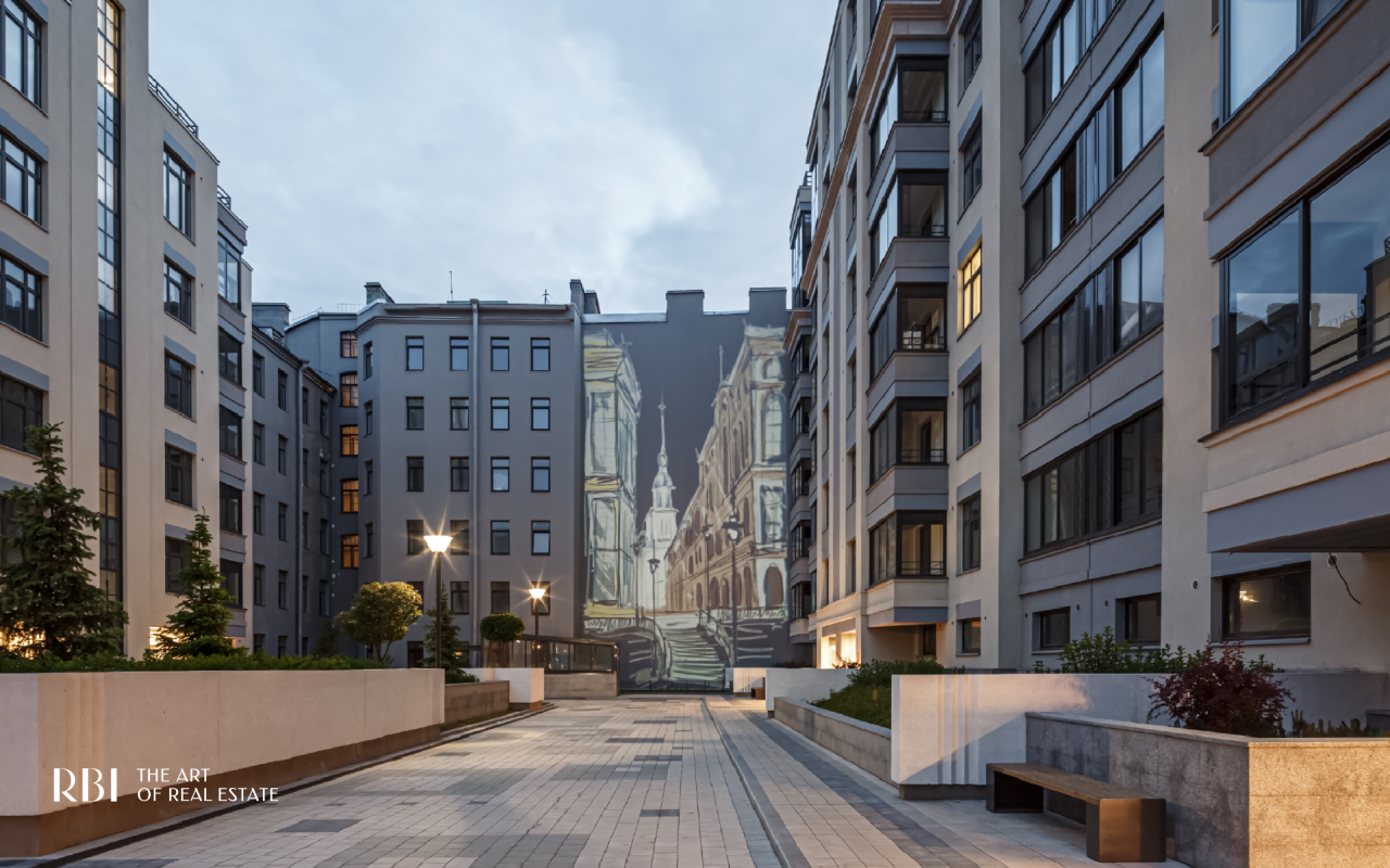 А брандмауер во внутреннем дворе превращен в световую инсталляцию с изображением ночного города. Она расширяет панораму двора и добавляет ему питерского шарма.